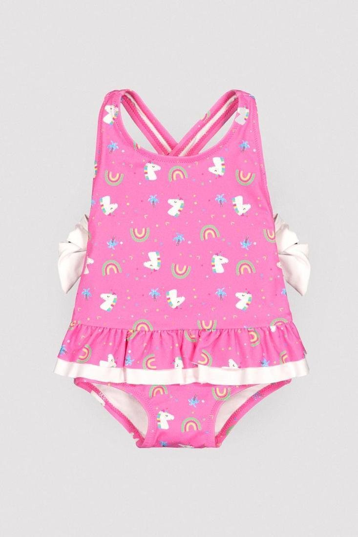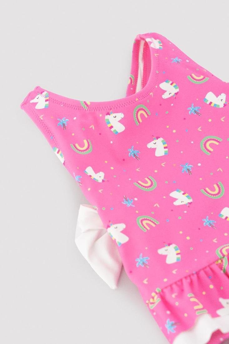 Bañador con estampado de unicornios con tirantes cruzados y volantes en la cintura. Incluye lazos de tela blanca a contraste.