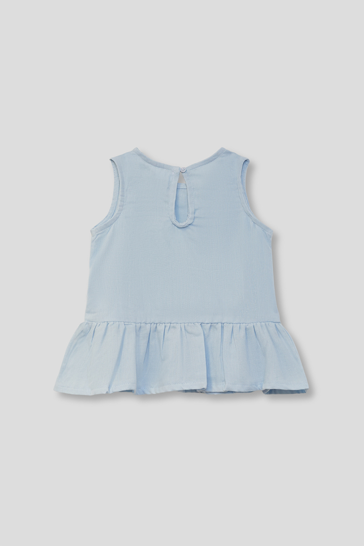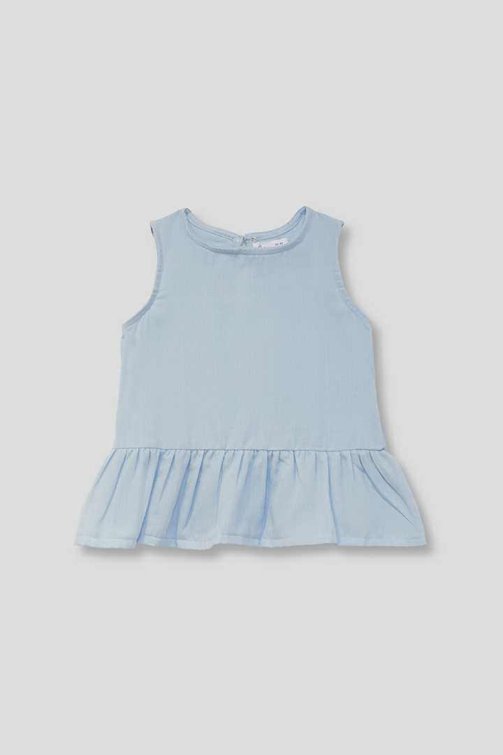 Blusa sin mangas para niña en color celeste. Diseño con volante en el bajo y cierre trasero, confeccionada en tejido ligero y fresco.