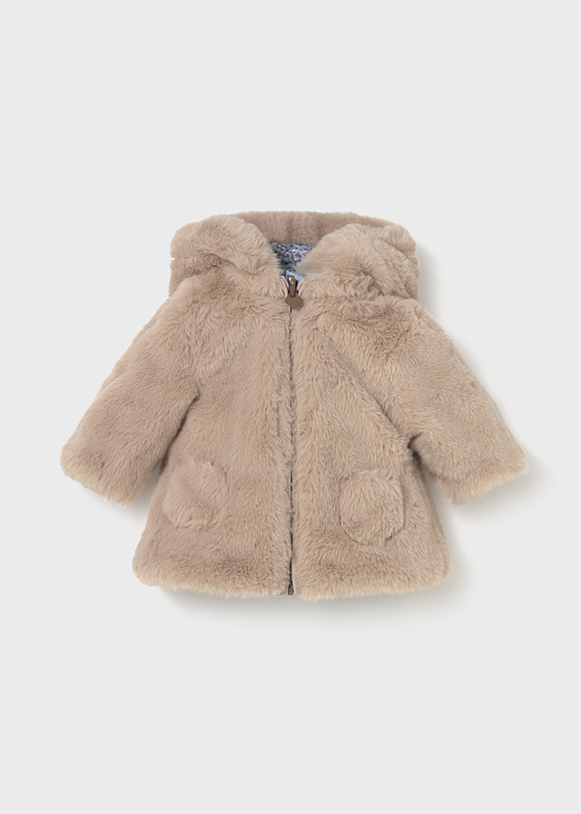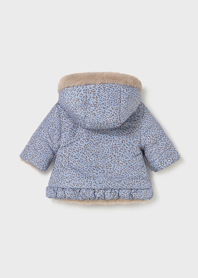Contiene poliéster reciclado. Chaquetón de manga larga para recién nacido con puños elásticos. Capucha con detalles de pelo. Cierre con botones en la parte delantera. Bolsillos delanteros. Este modelo presenta un diseño reversible.