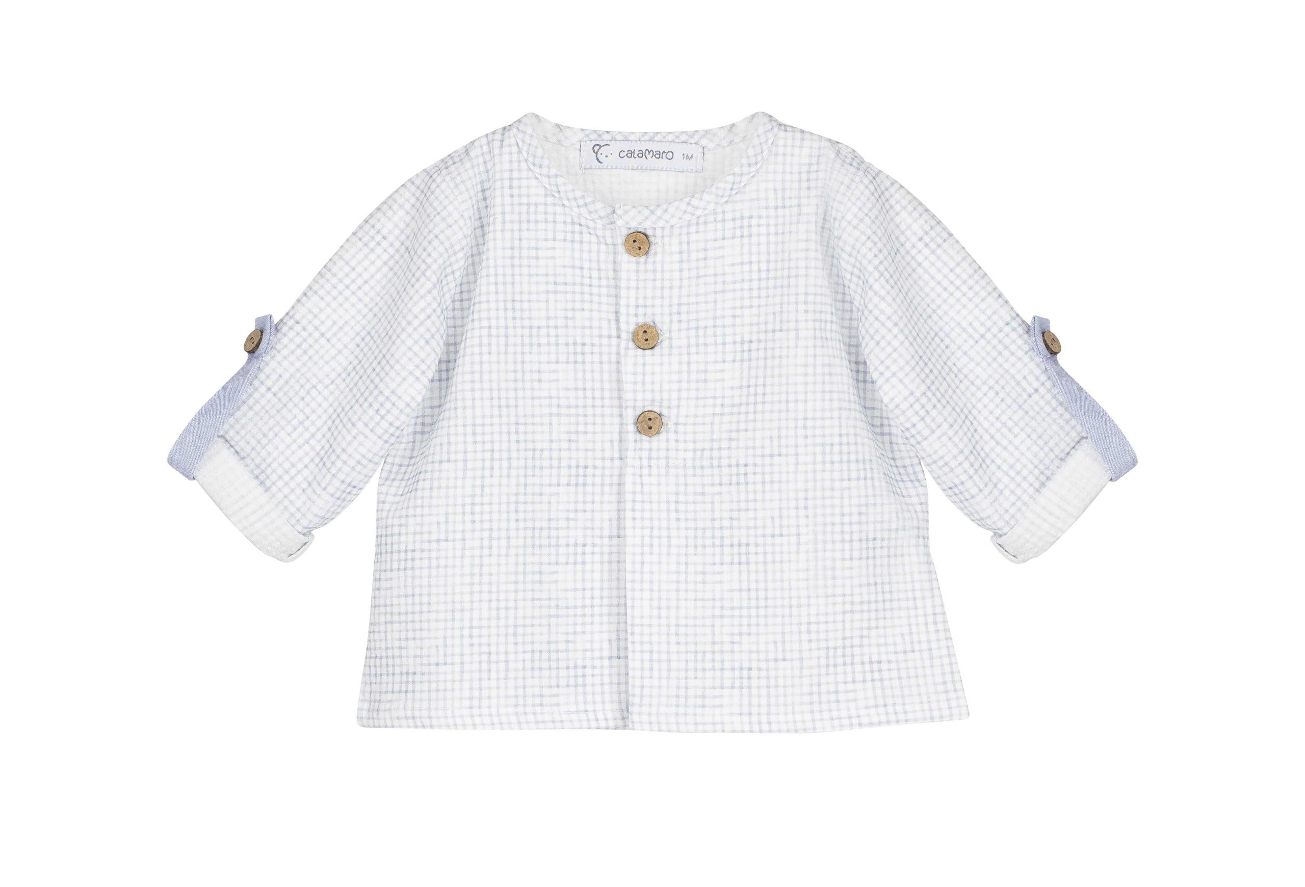 Compuesto por camisa de manga larga en tejido suave de cuadro fino blanco y azul claro, con cuello redondo, botones delanteros efecto madera y mangas con trabilla para poder llevarlas recogidas. Se combina con pantalón corto en azul claro liso, de corte cómodo y cintura adaptable para un ajuste perfecto.