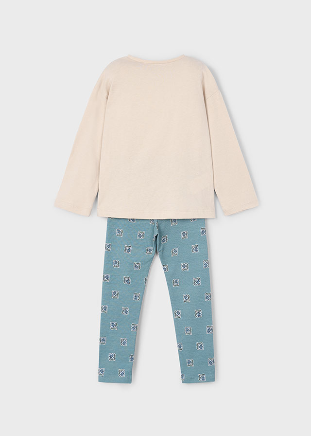 Conjunto de dos piezas para niña compuesto por una camiseta y un pantalón tipo legging combinado.