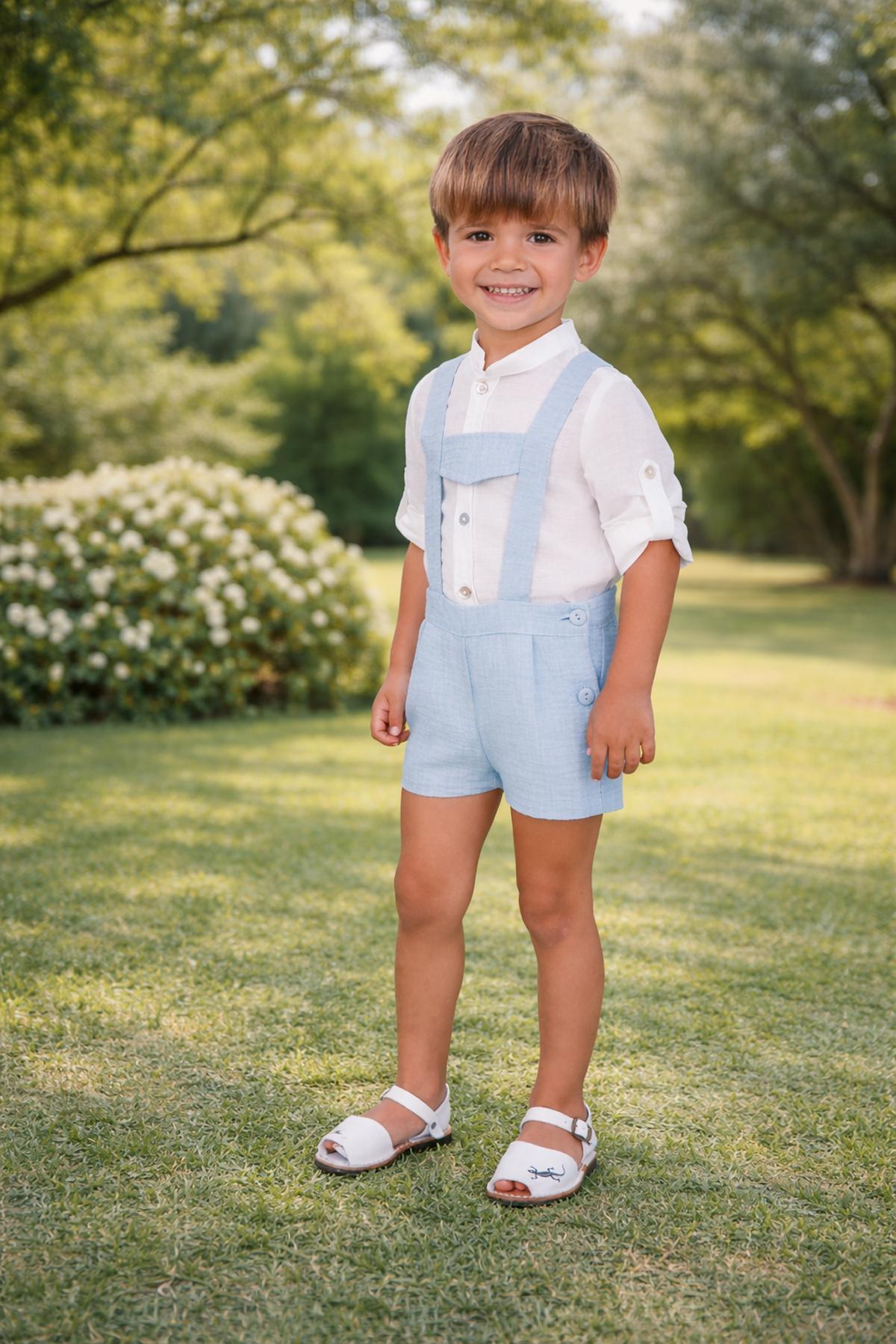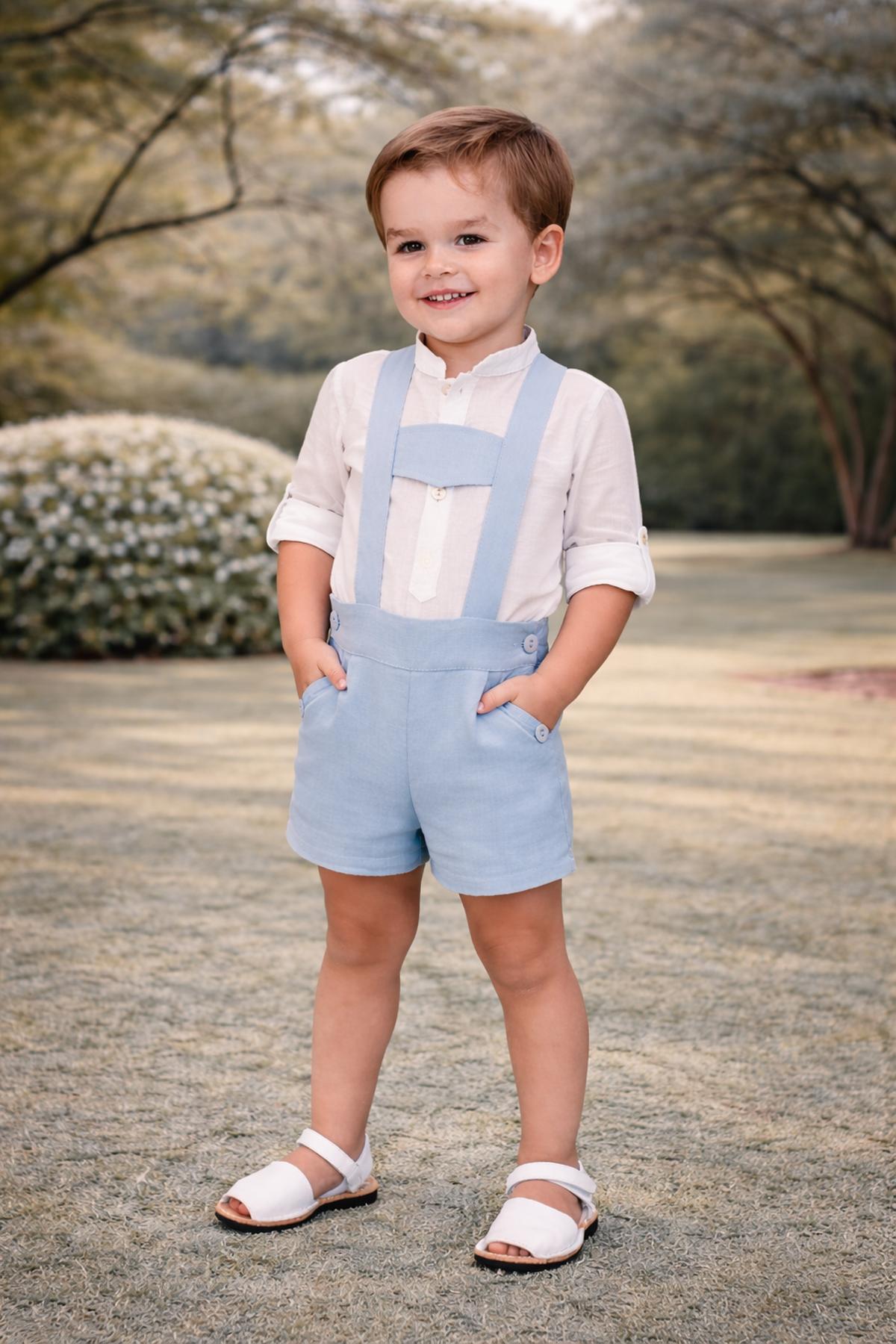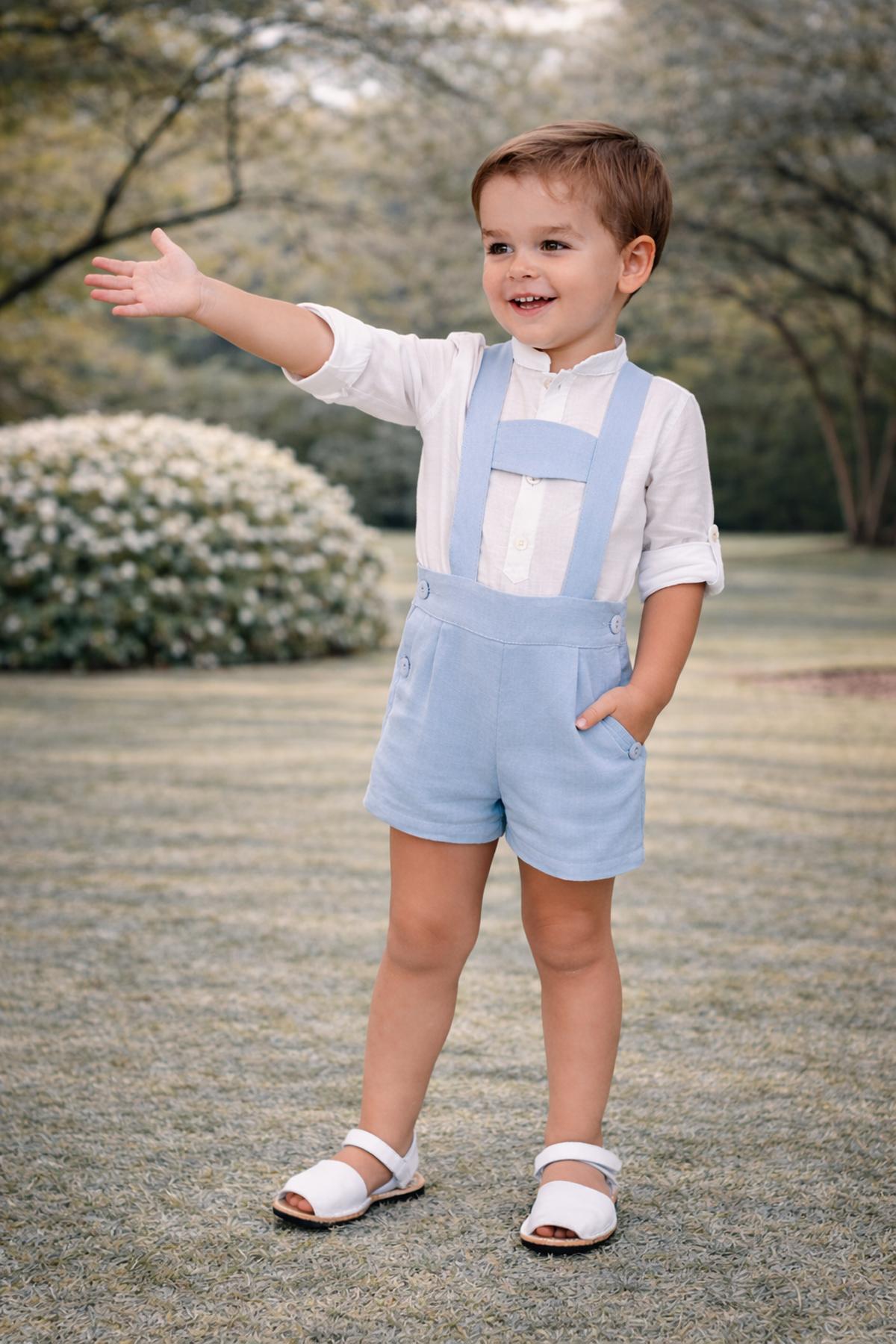 Está compuesto por camisa blanca de manga larga con cuello mao, confeccionada en tejido ligero y suave para mayor comodidad, y pantalón corto con tirantes en tono azul con detalle de botones decorativos en la cintura, que aporta un aire clásico y sofisticado.