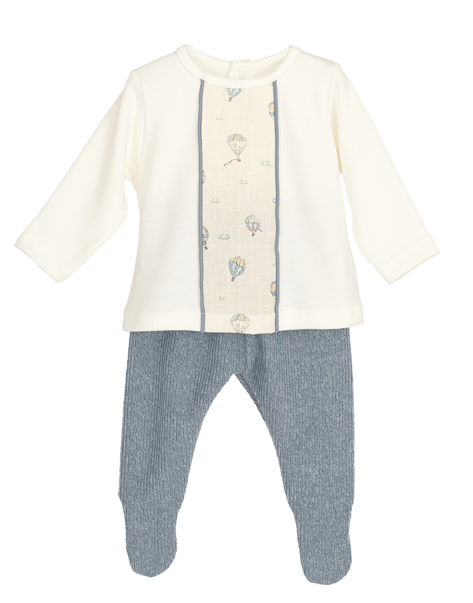 Conjunto polaina 100%  algodón compuesto por dos piezas . Jubón en color marfil.Cuello redondo.Detalle en la parte delantera con estampado de globos.Botones modo corchete en la parte trasera. Polaina en color azul.Cintura antipresión.