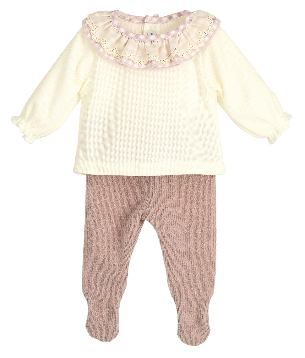 Conjunto polaina 100% algodón compuesto por dos piezas . Jubón en color marfil.Cuello redondo con doble volante, en vichy crudo y nude y batista .Botones modo corchete en la parte trasera. Polaina en color nude.Cintura antipresión.