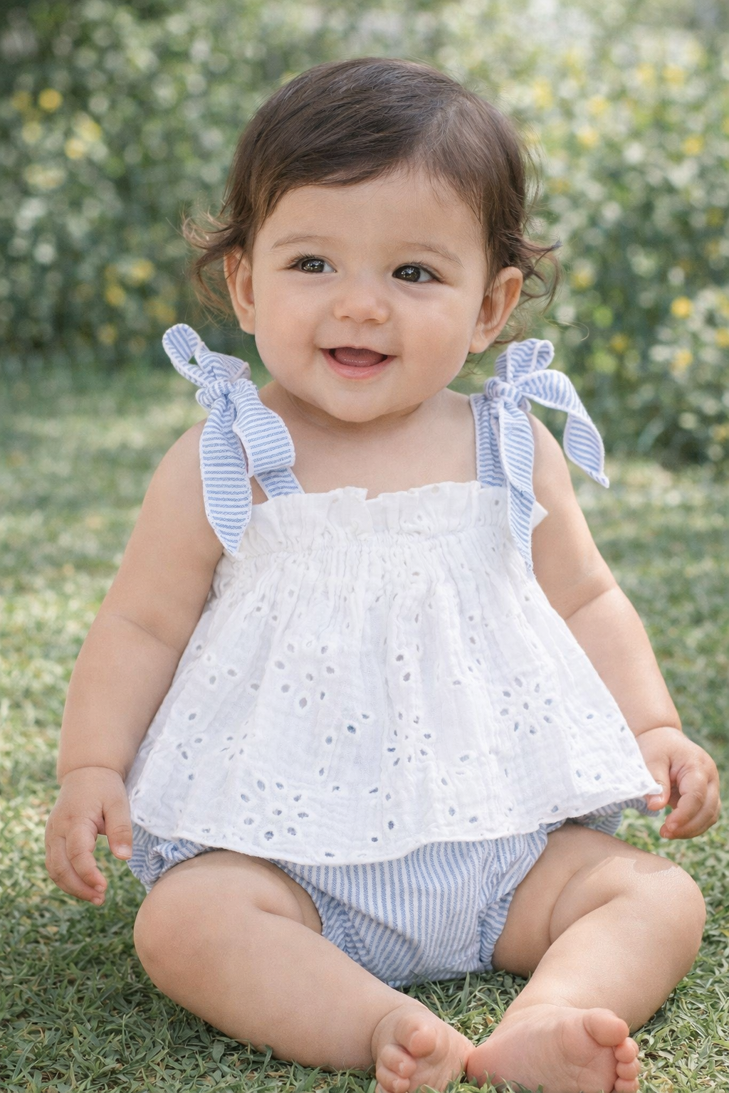 Conjunto de pololo para niña, ideal para los días de verano. Compuesto por blusita blanca de tejido ligero con delicados bordados y tirantes ajustables con lazadas, combinada con pololo a rayas en tonos azules. Un diseño cómodo, fresco y muy favorecedor, pensado para que las más pequeñas vayan arregladas sin renunciar a la comodidad.
