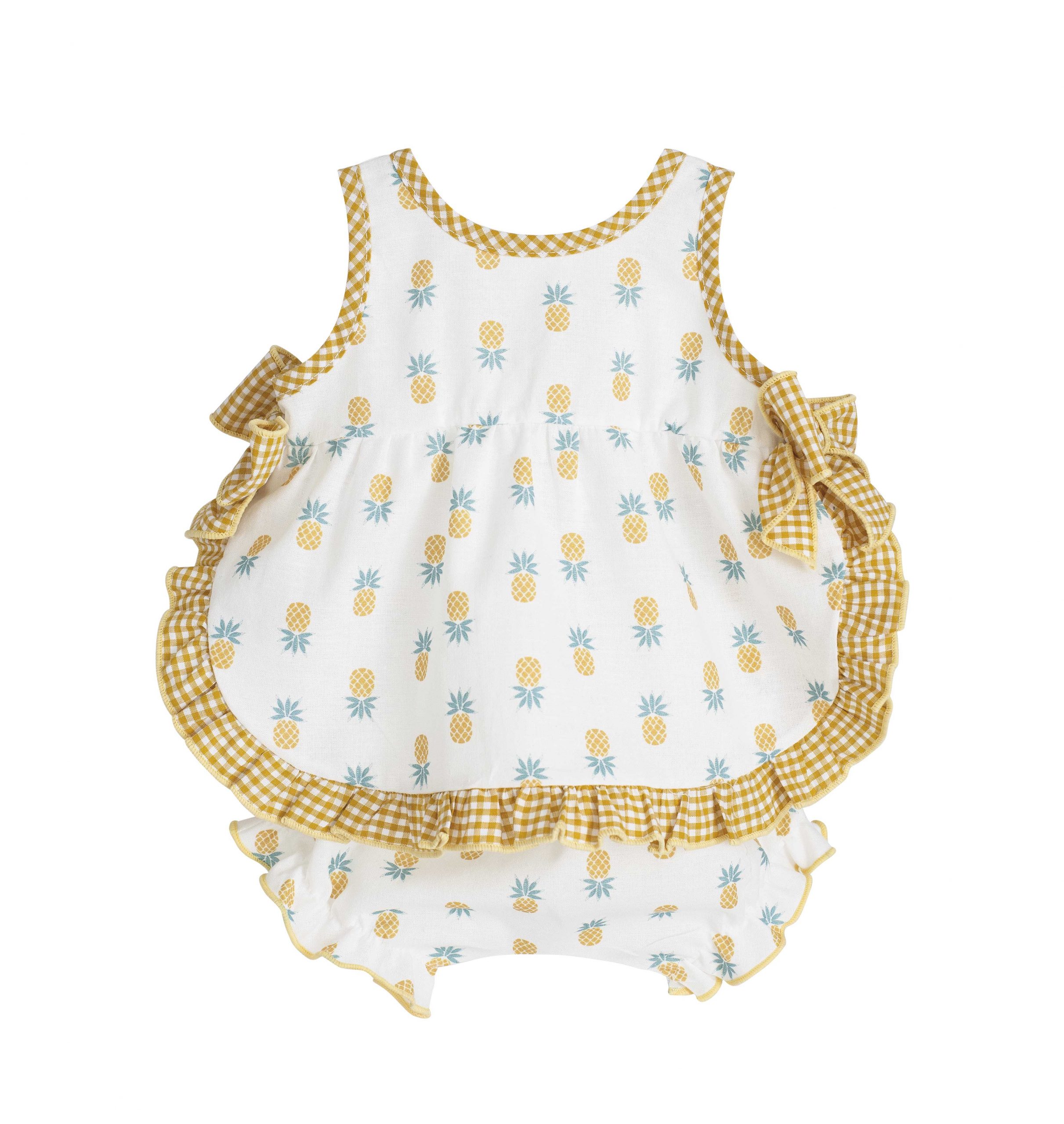 El Jesusito Gaya es una prenda ideal para los días de primavera y verano. Confeccionado en tejido ligero y transpirable estampado de piñas con volantes vichy en tonos mostaza y lazos laterales, junto con un cubrepañal del mismo tejido, clásico y atemporal.