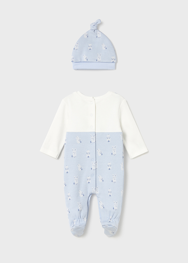 Pelele de manga larga para recién nacido. Cuello redondo. Diseño con peto simulado en superposición. Cierre con botones a presión en la parte posterior. Botones a presión en la entrepierna para facilitar la puesta de la prenda. Cálido tejido elegante y sofisticado para las ocasiones más especiales. Prenda con pernera extensible.