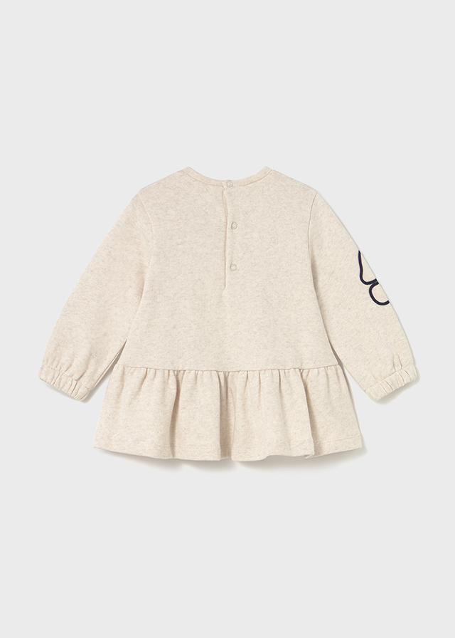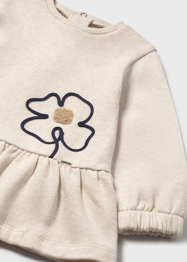 Vestido de manga larga para bebé con puños elásticos. Cuello redondo. Cierre con botones a presión en la parte posterior. Modelo con rizo. Elementos de adorno: bordados. Motivo de flores.