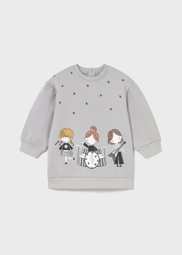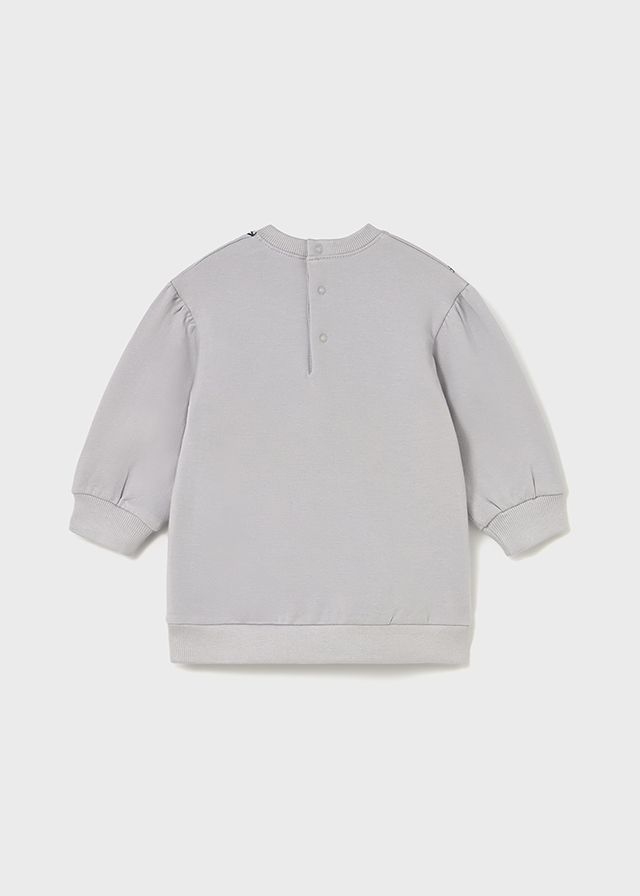 Vestido de manga larga para bebé. Cuello redondo. Cierre con botones a presión en la parte posterior. Cálido tejido de felpa gruesa (felpa perchada), perfecta para los meses fríos. Modelo con rizo. Elementos de adorno: serigrafía (print).
